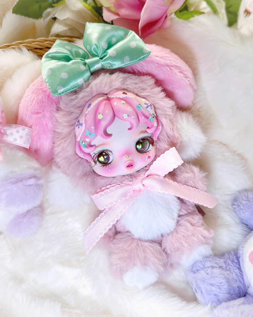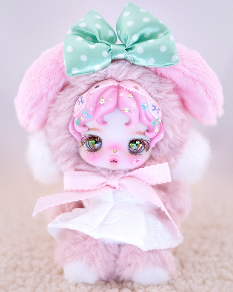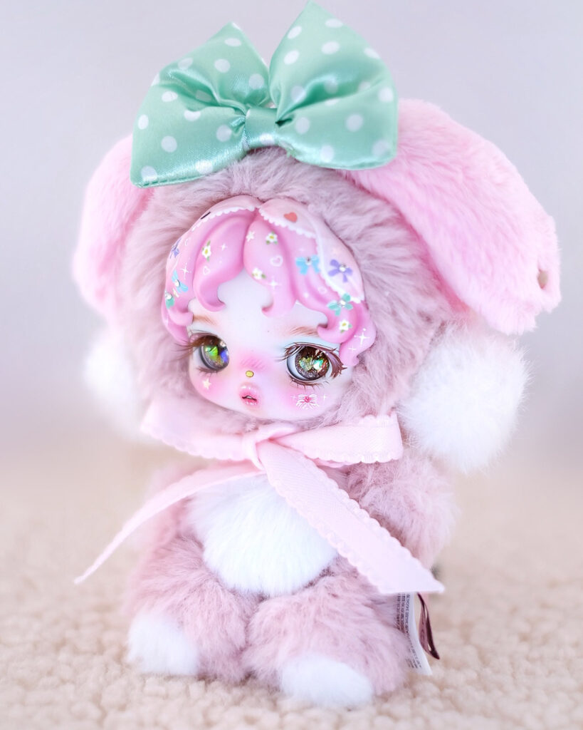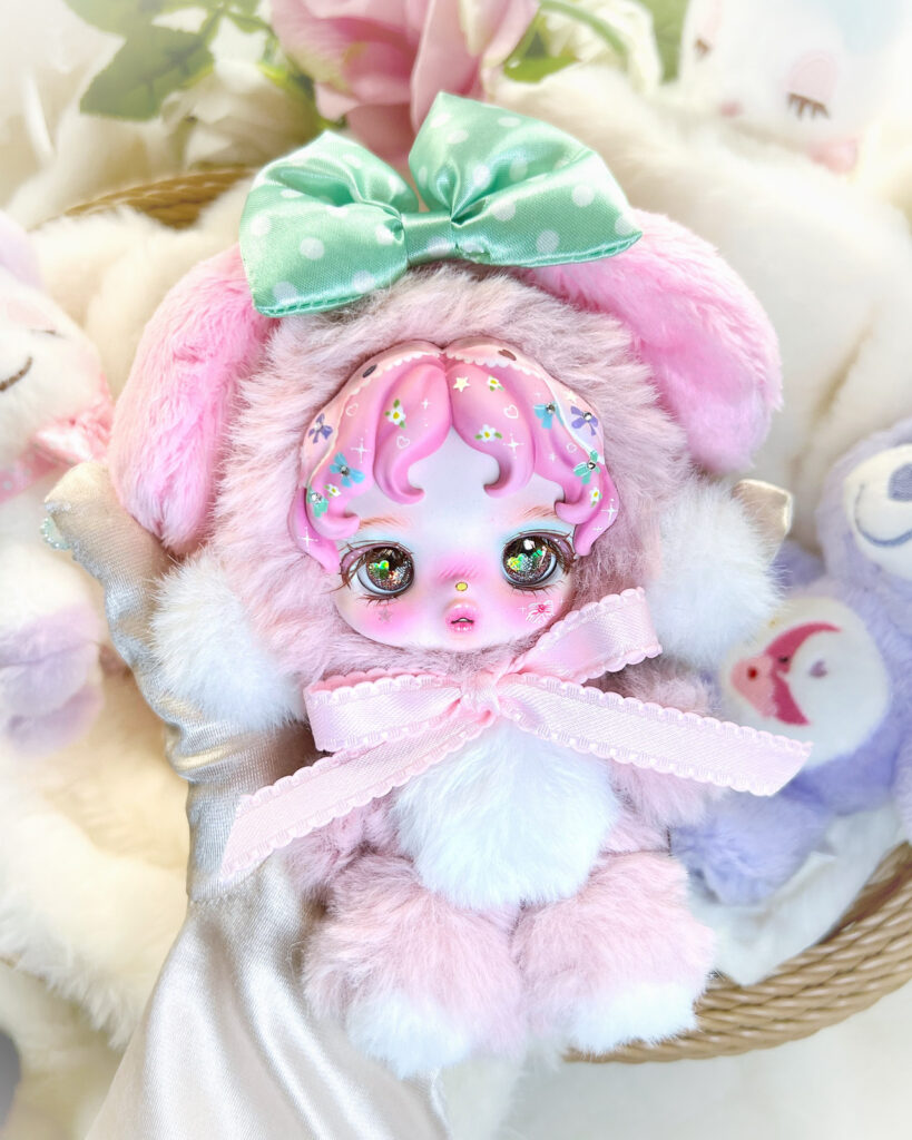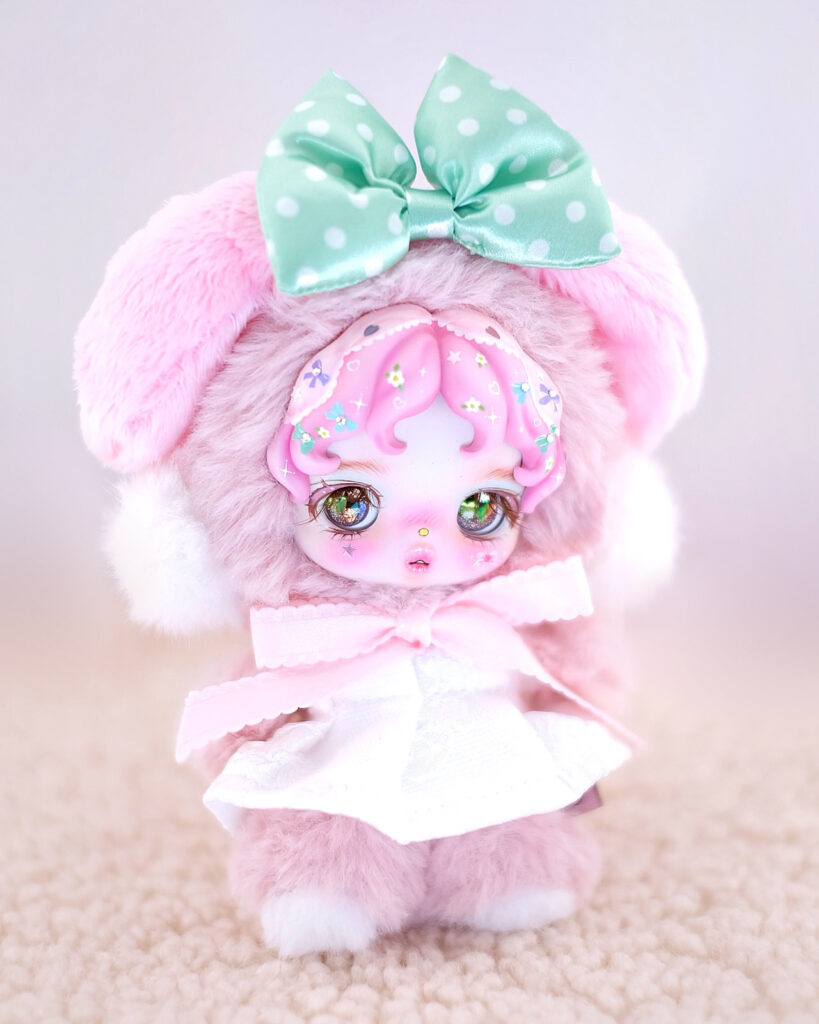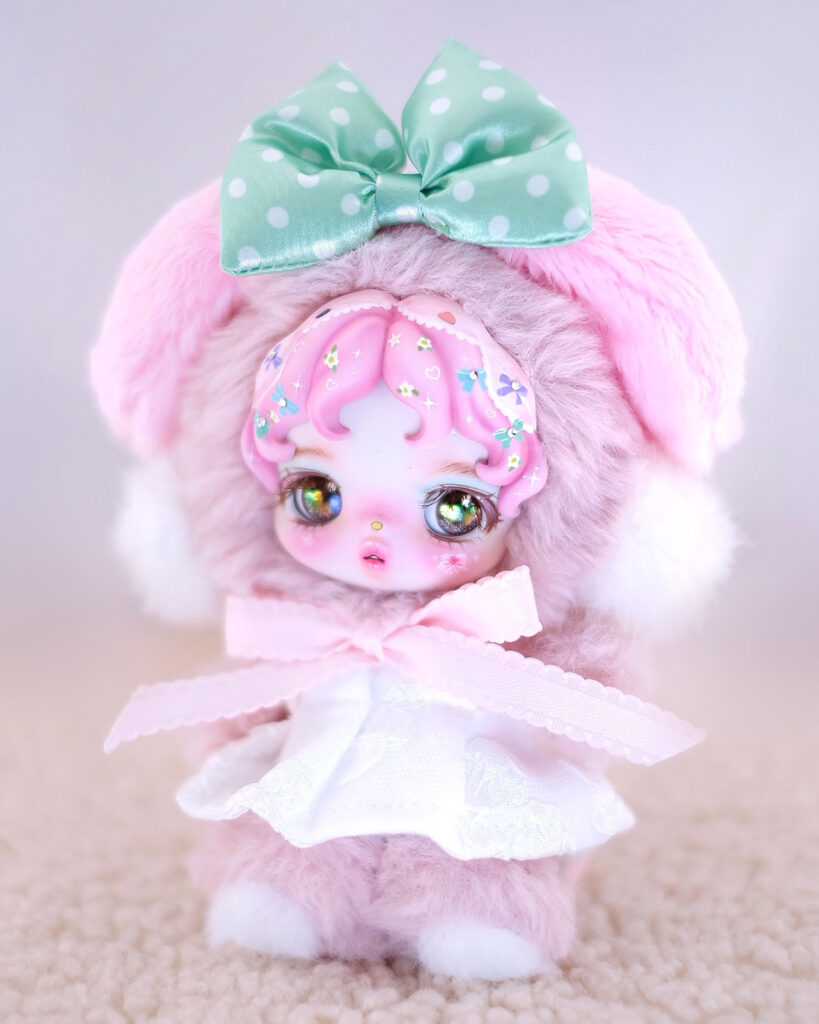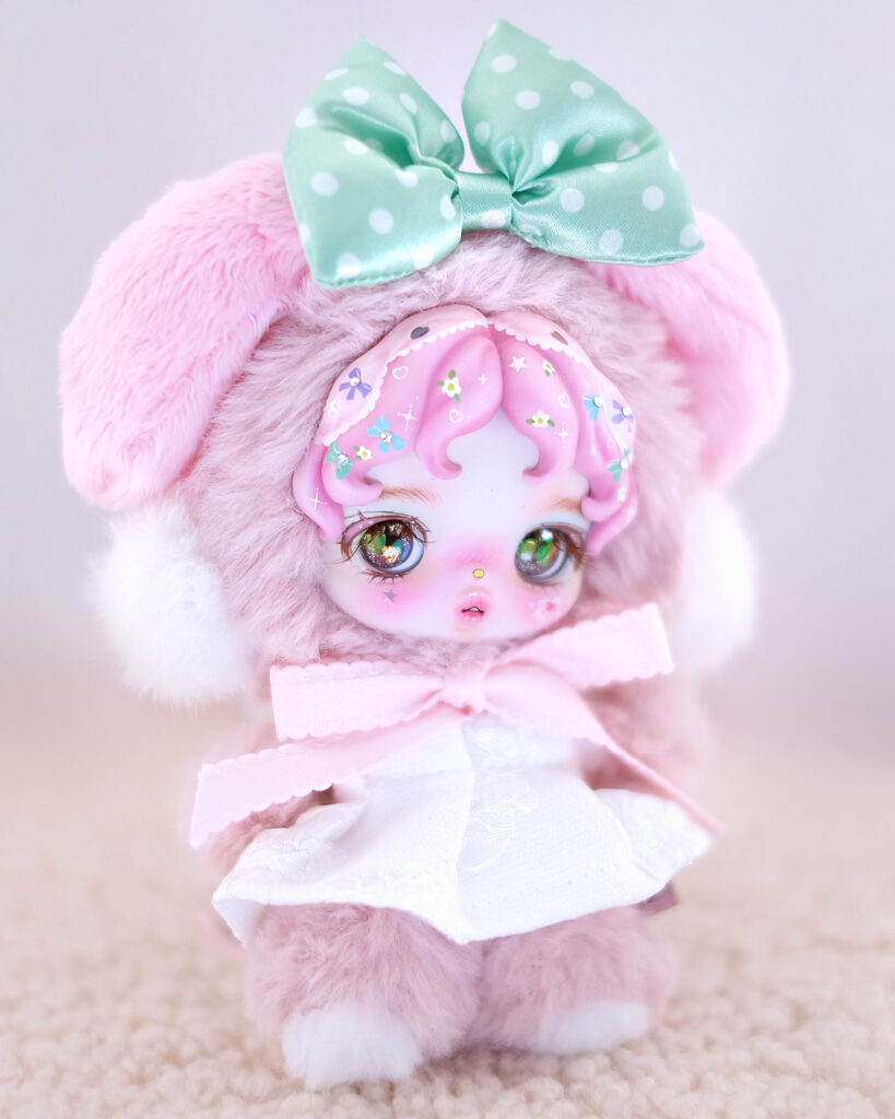 Fluffy pastel pink with custom white tummy and paw fur for extra poof, finished in a sweet lolita look. Hand-painted eyes and soft blush for that daydream sparkle.